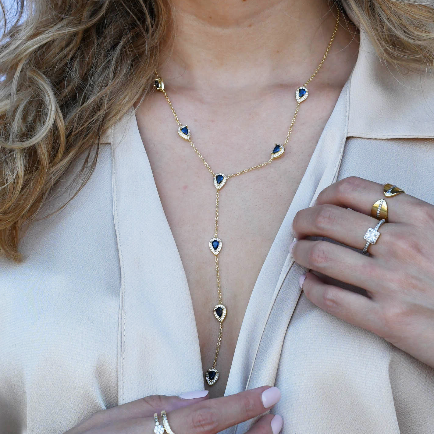 - Turn heads with stunning design featuring teardrop-shaped blue toned crystals framed in shimmering gold.