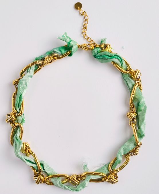 • Fresh and uplifting! This necklace features a soft mint green silk ribbon woven through bold, knotted gold links.