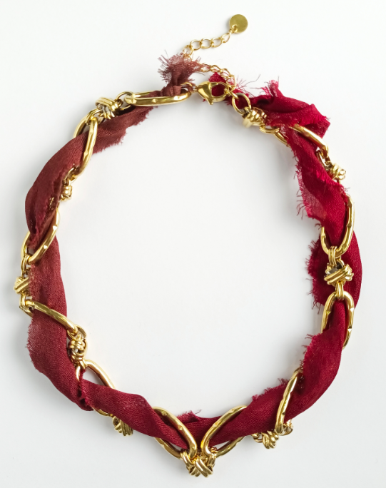 - Silk ribbon wind through bold, knotted gold links, creating a necklace that exudes both elegance and edge.