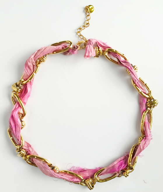 - Feminine and fun. This necklace intertwines soft pink ribbon with bold, knotted gold links for the perfect mix of sweet and statement.