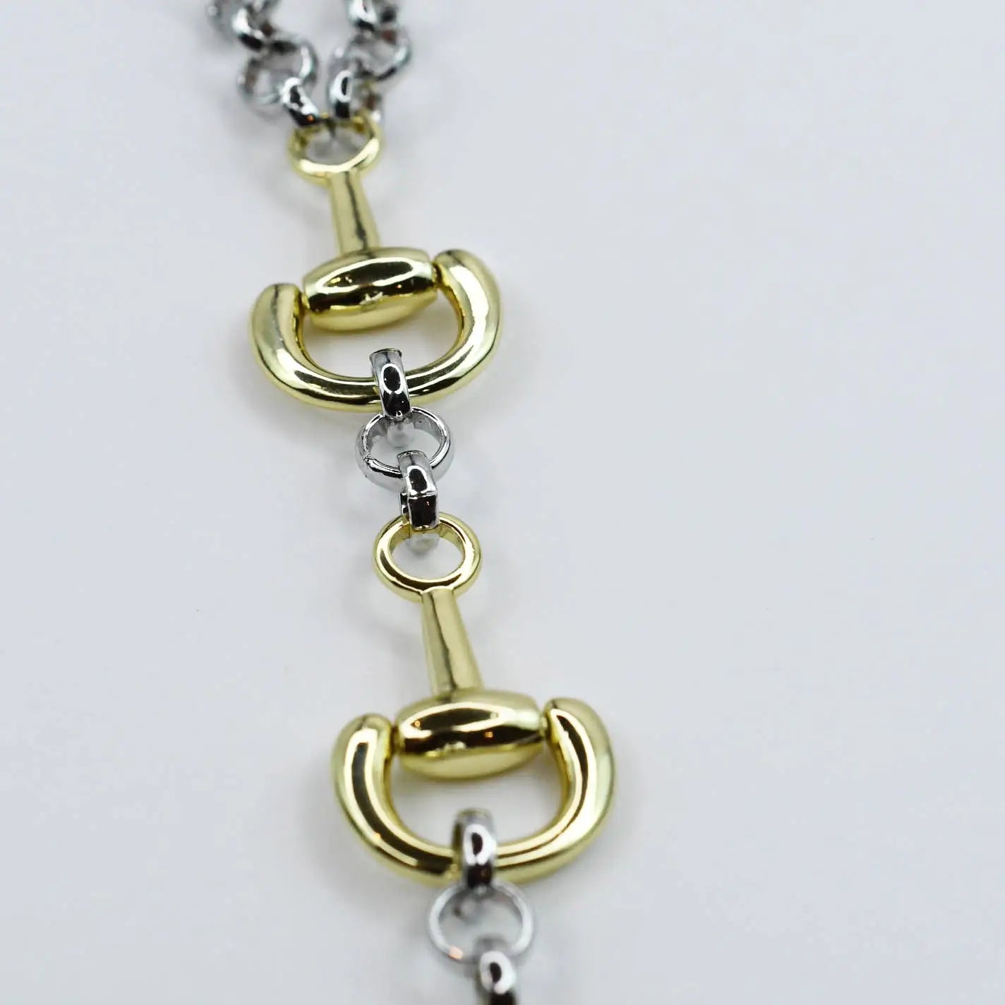 Inspired by timeless equestrian style, blends bold sophistication with everyday elegance. - Featuring silver chain links accented by golden horse-bit inspired details. This striking piece adds a refined touch to any look.