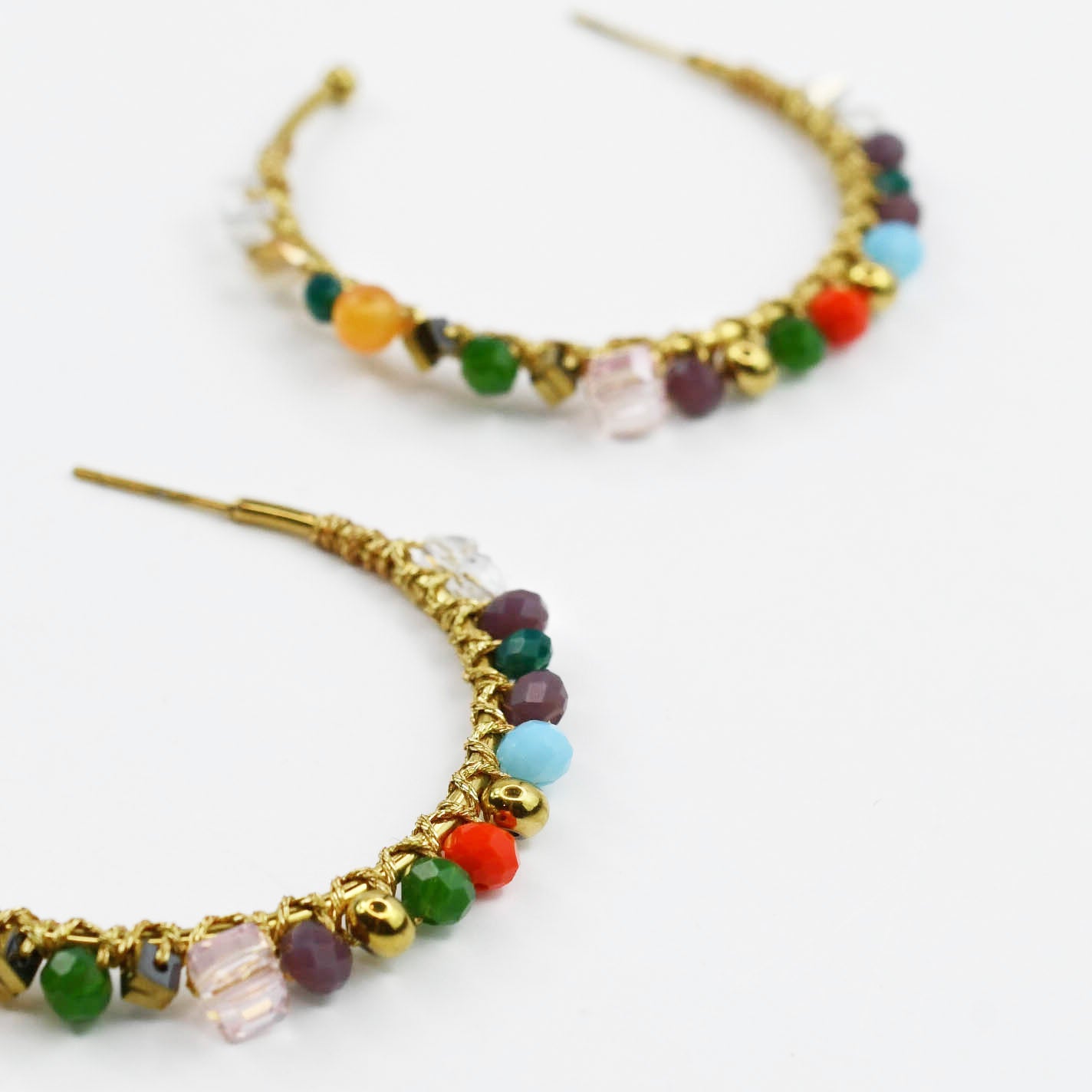 - Crafted on a sleek gold tone frame, each hoop is hand wrapped with a vibrant mix of beads in rich jewels tones.