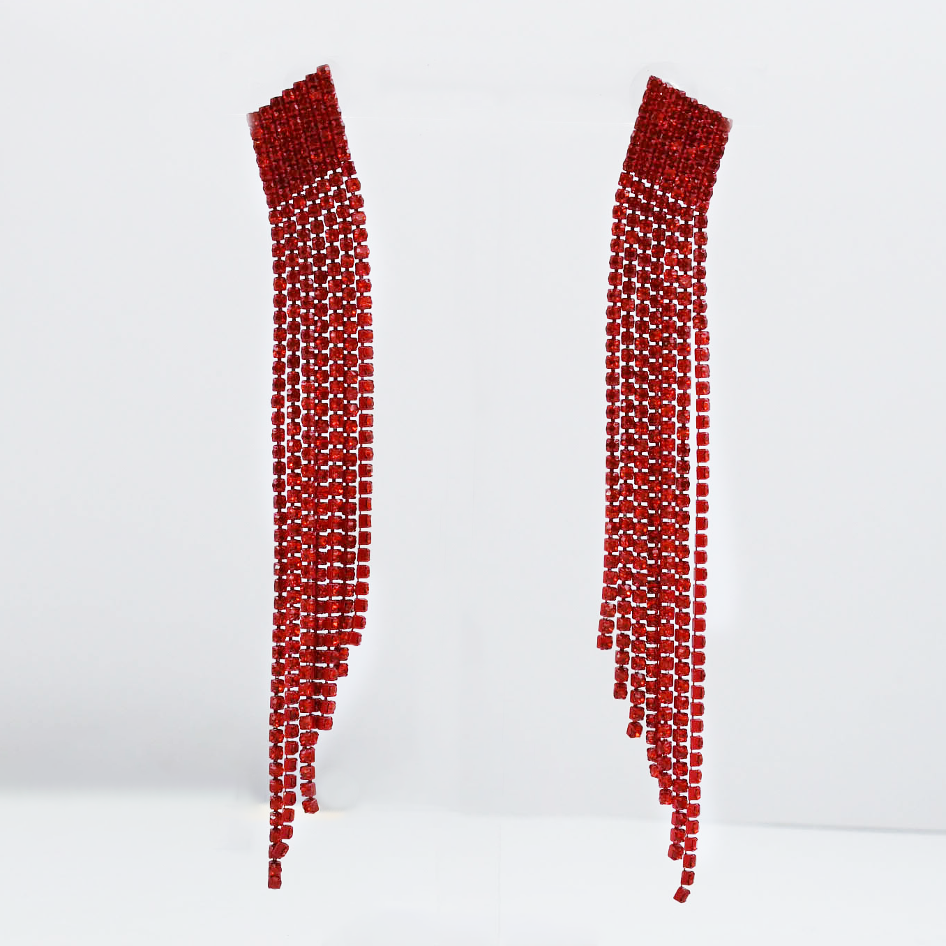 - Made for the spotlight. These dramatics statement drops feature cascading rows of red rhinestones that shimmer with every move.