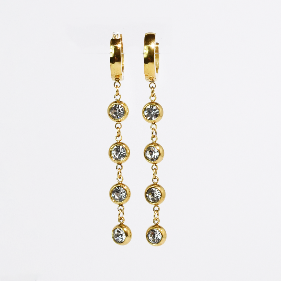 Minimal gold huggies finished with dangling crystals—simple, elegant, and chic.