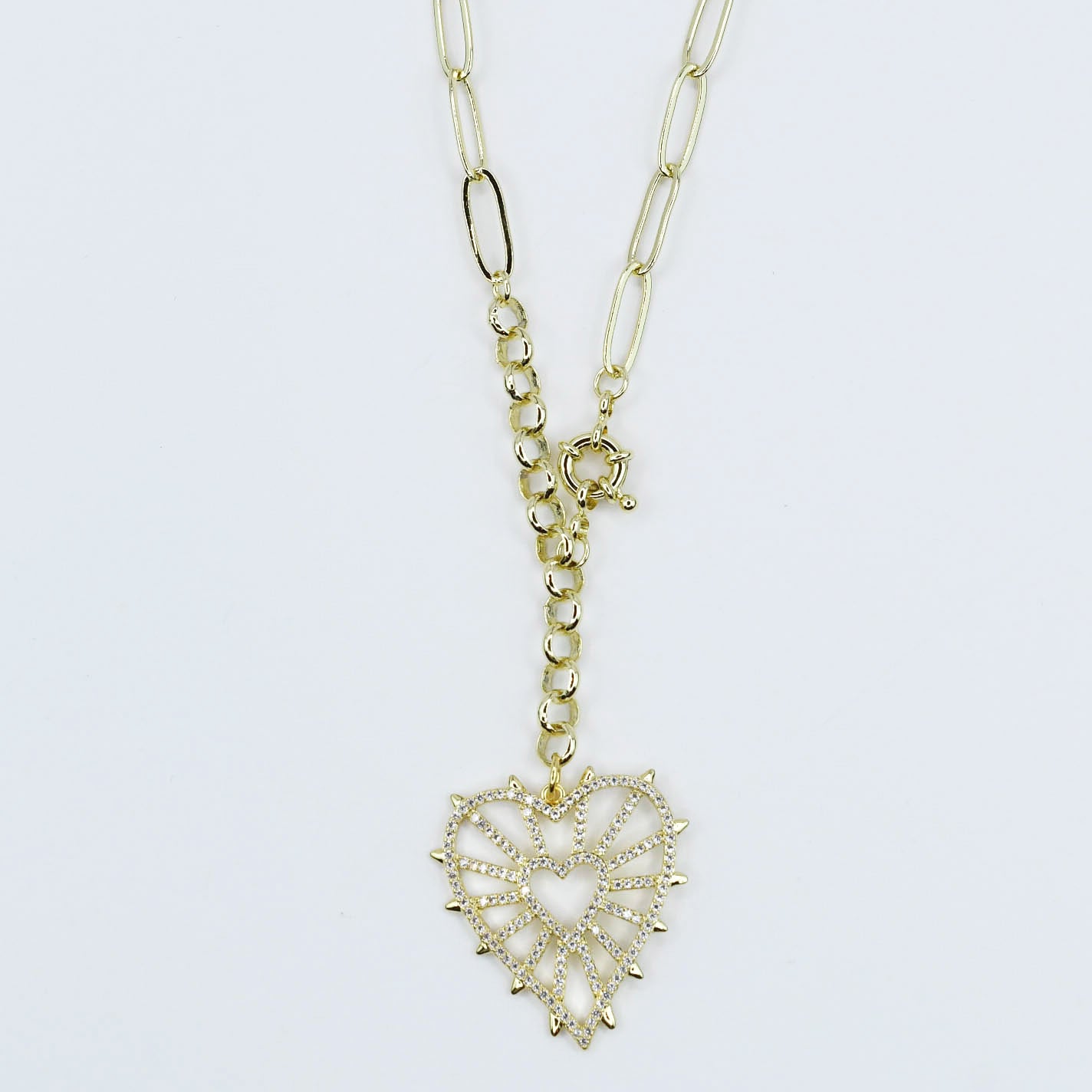 - Featuring a gold paperclip chain and stunning overwork heart pendant with lace-like detailing. This piece blends feminine charm with modern edge.