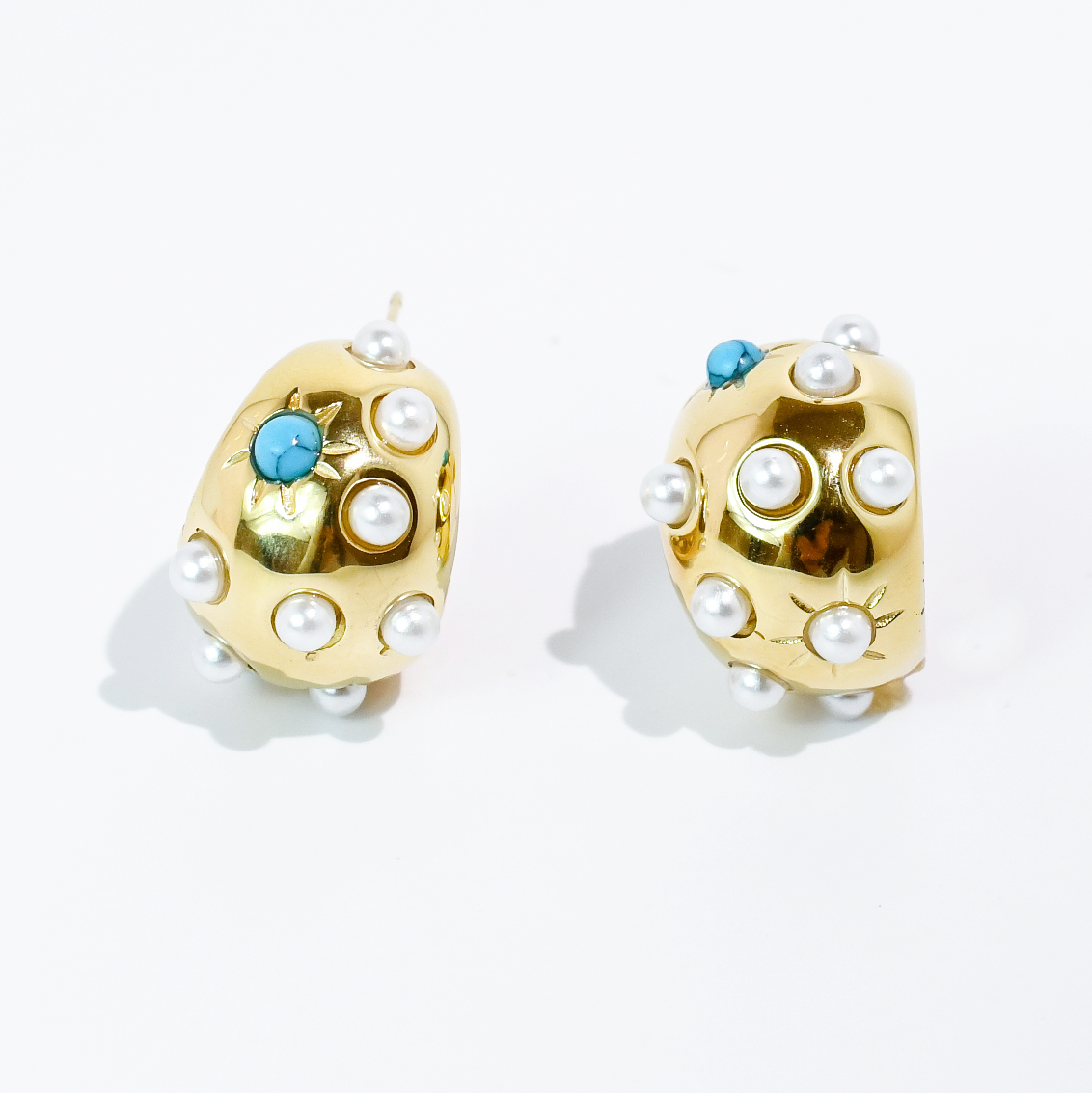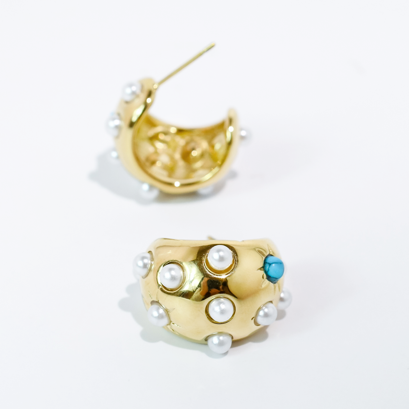- Playful sparkle with a modern twist. Features a bold gold tone dome design accented with delicate pearl details and a pop of soft blue stone for a fresh, eye catching look.