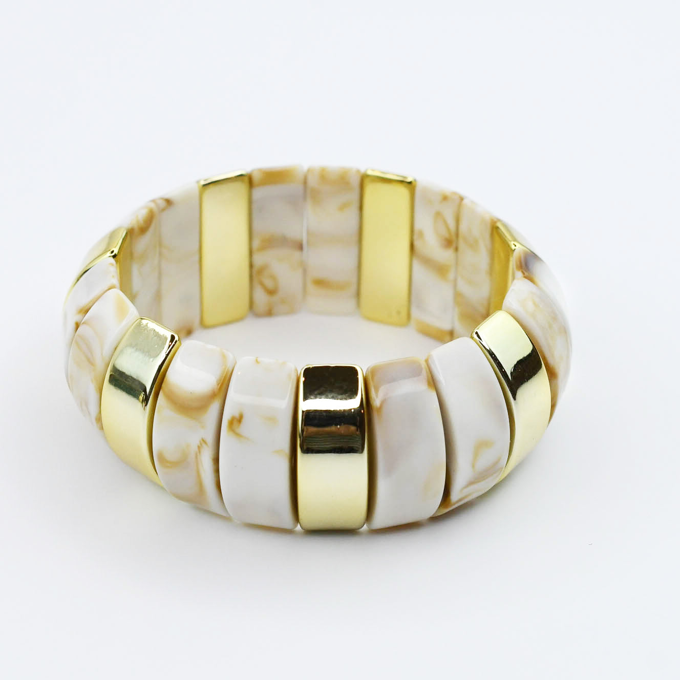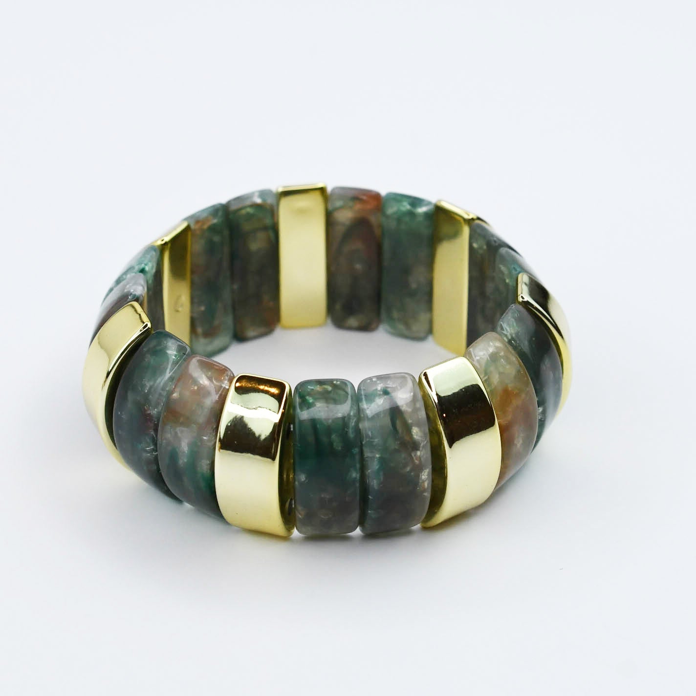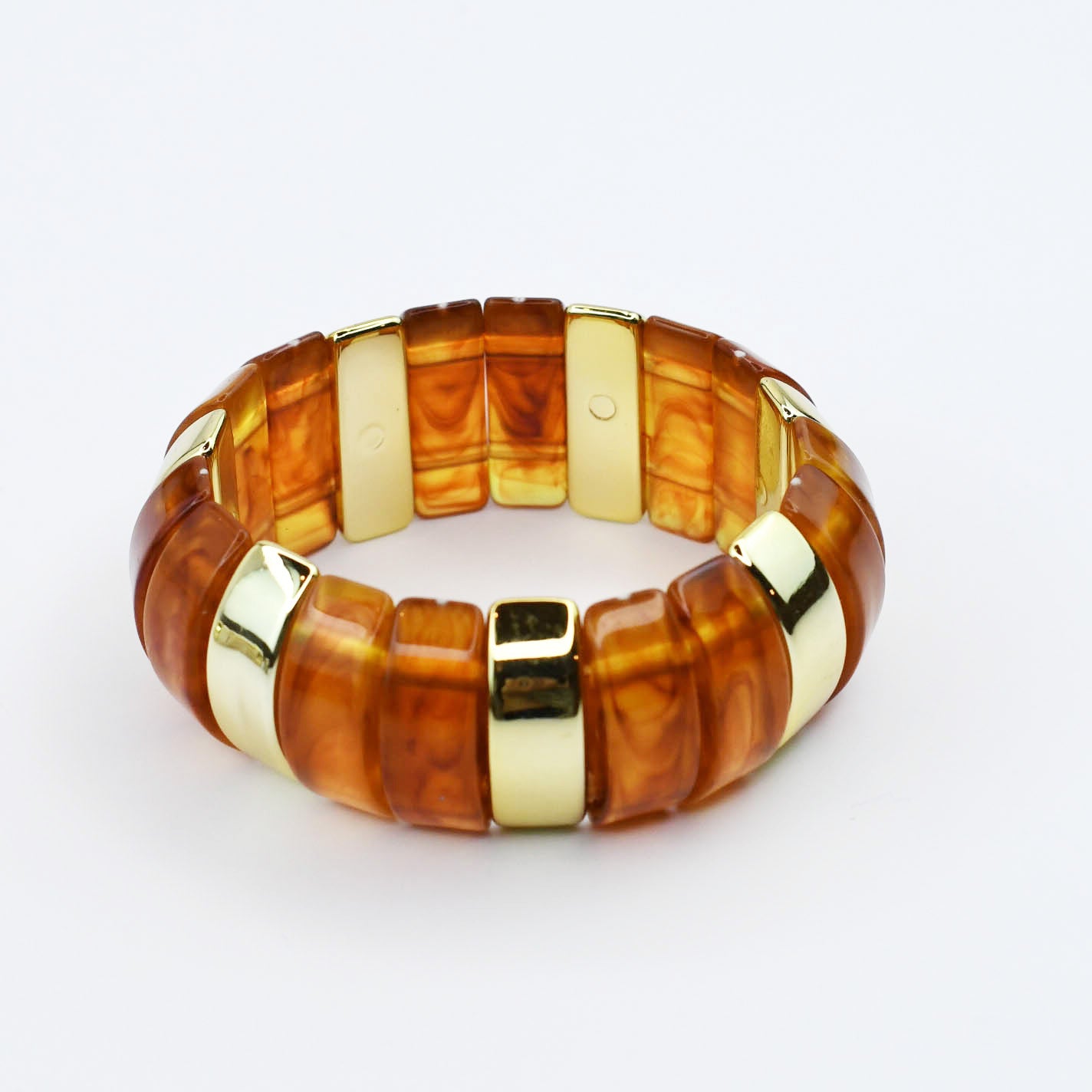 - Designed with glossy resin links in earthy tones, each bracelet is accented with high shine gold spacers for a luxe finish.