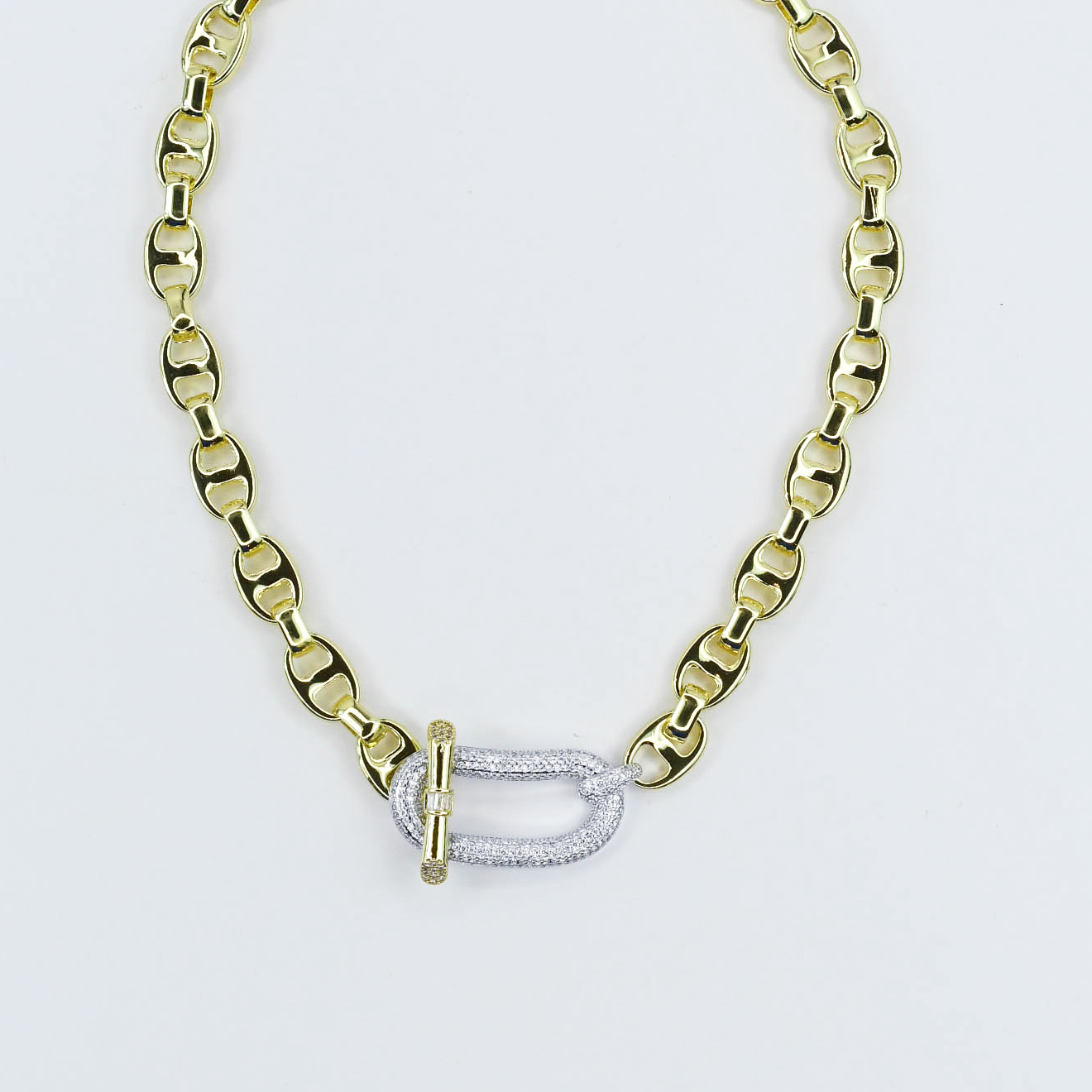 - Featuring chunky gold links and a crystal-encrusted clasp, this statement piece radiates confidence and sophistication. Its mixed-metal detail adds a touch of sparkle while keeping the look sleek and versatile.