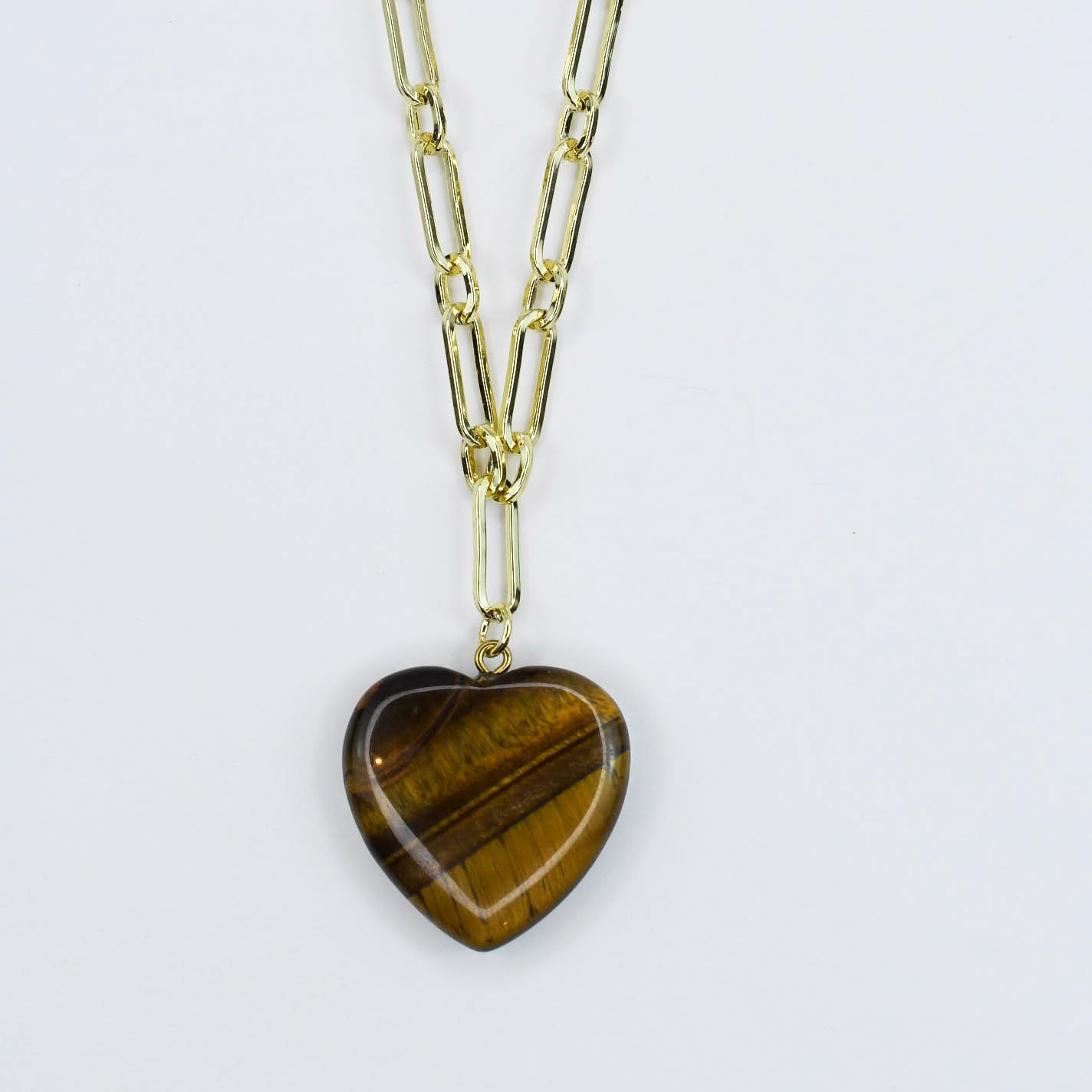 - Featuring a bold gold link chain and glossy tiger's eye style heart pendant. This piece blends elegance with earthy beauty.